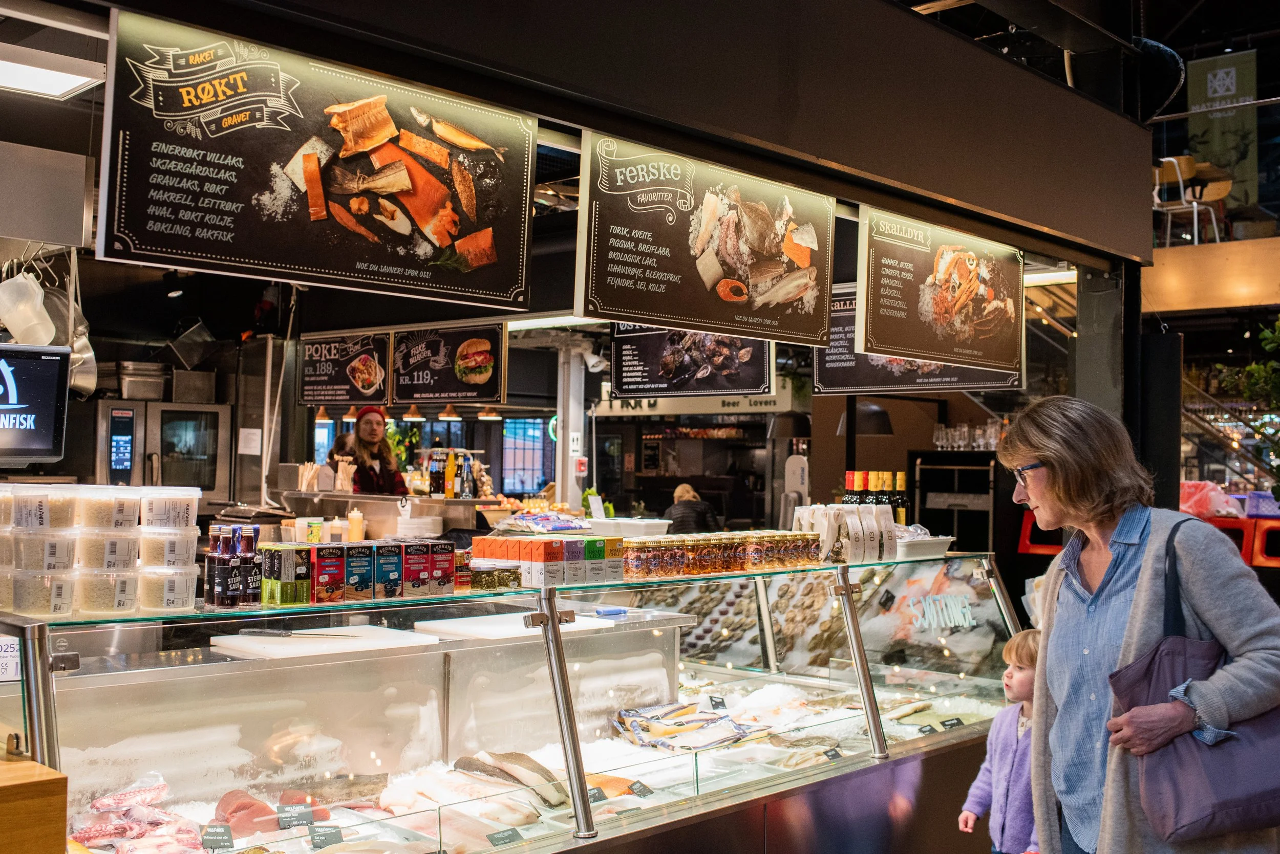 A shopper inspects the fish at Vulkanfiska, a seafood outlet in Oslo’s Mathallen food hall. Aquaculture accounts for more than half the seafood consumed globally