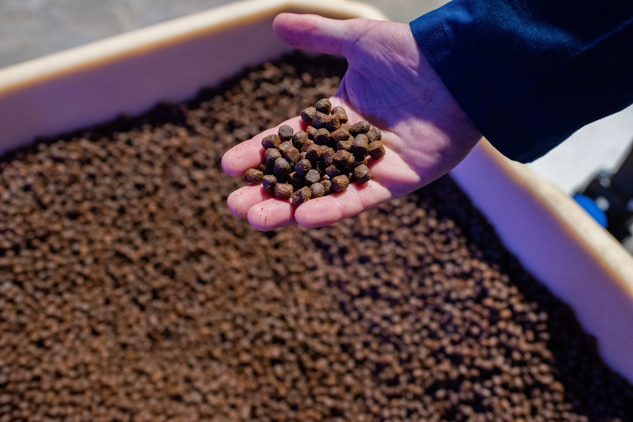 A box of feed at Fredrikstad. The company says the pellets contain soy from Europe and a mix of vegetable and fish oil