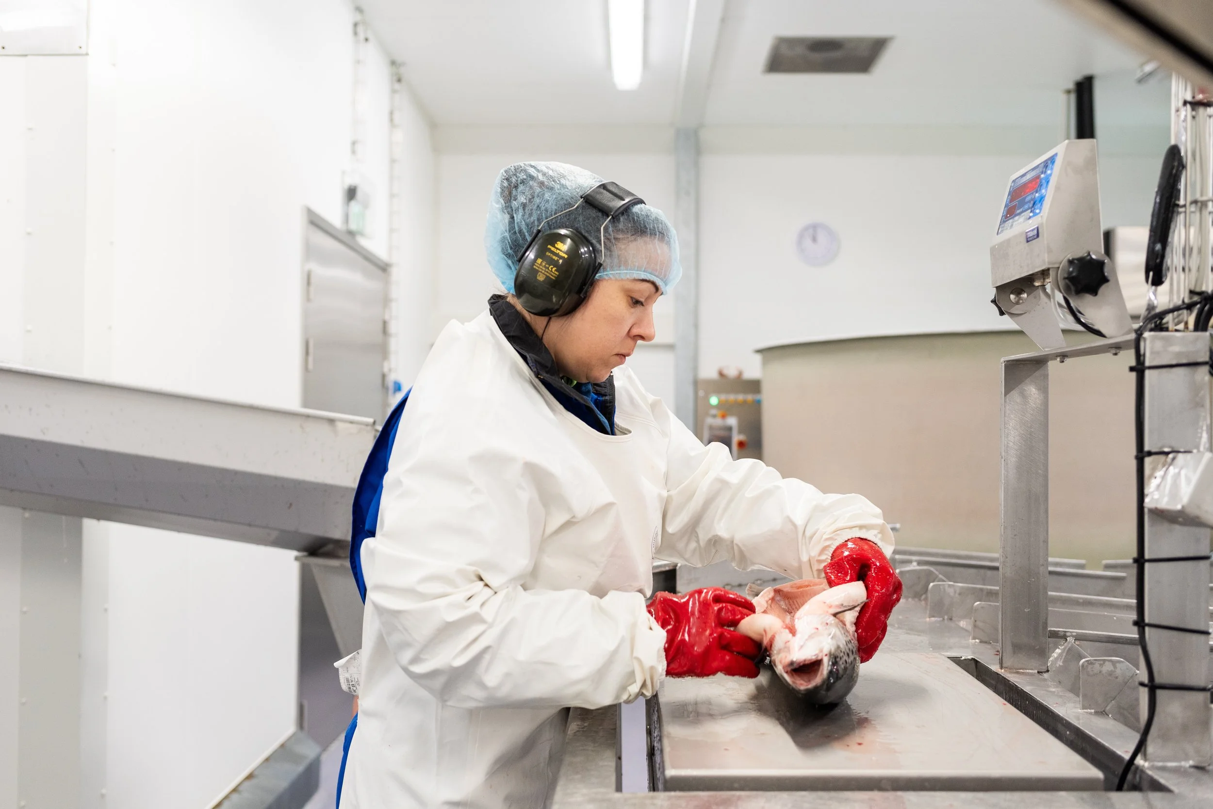 A Fredrikstad worker inspects a salmon that has been processed and cleaned before sorting it according to colour, size and quality